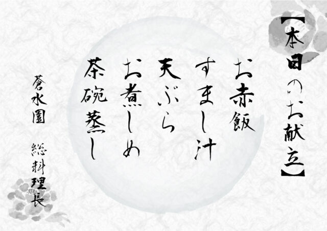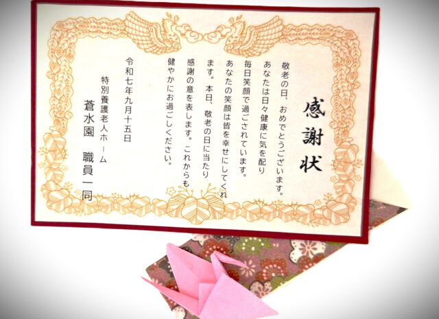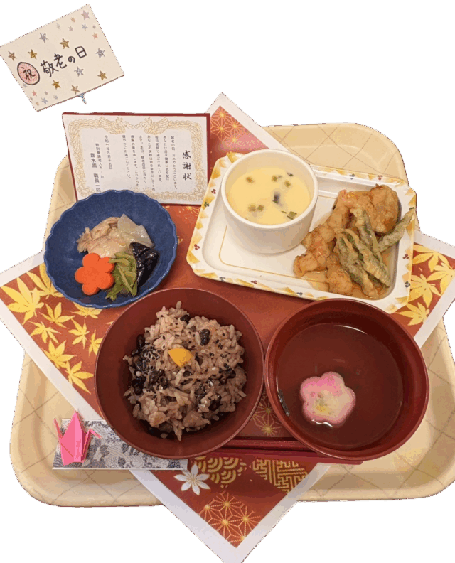 蒼水園からも敬老の日に際して、総料理長(管理栄養士)から心を込めたお料理と感謝状が準備されました。