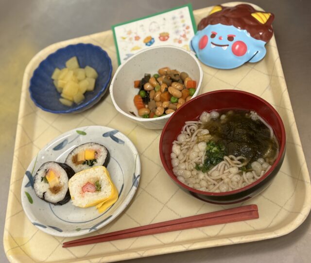 恵方巻き風の巻き寿司、温かいお蕎麦、煮豆、フルーツなど、彩り豊かな節分メニューをご提供しました。