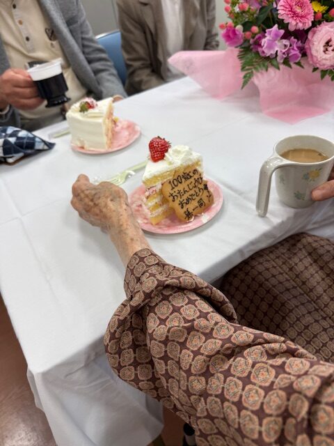 ご家族からはお誕生日ケーキのプレゼントもあり、ケーキには「100歳のお誕生日おめでとう(孫一同)」と書かれたメッセージクッキーが添えられ、華やかさと温かさが感じられました。